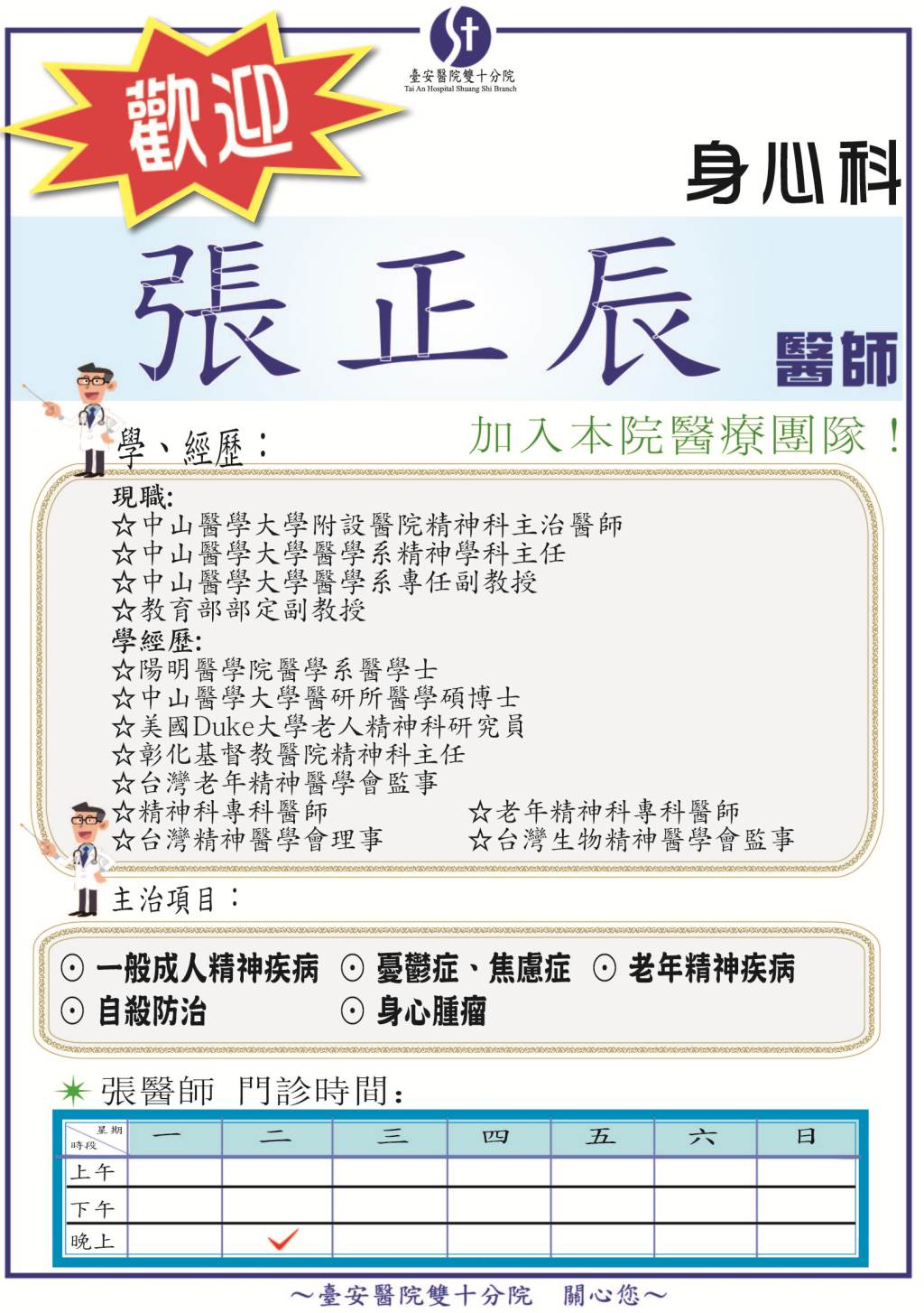 歡迎 身心科新進醫師-張正辰醫師(3月起每週二晚上)
