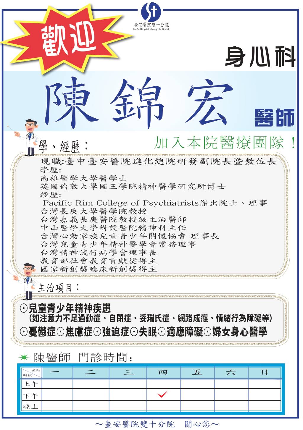 歡迎 身心科新進醫師-陳錦宏醫師(115年起每週四下午)