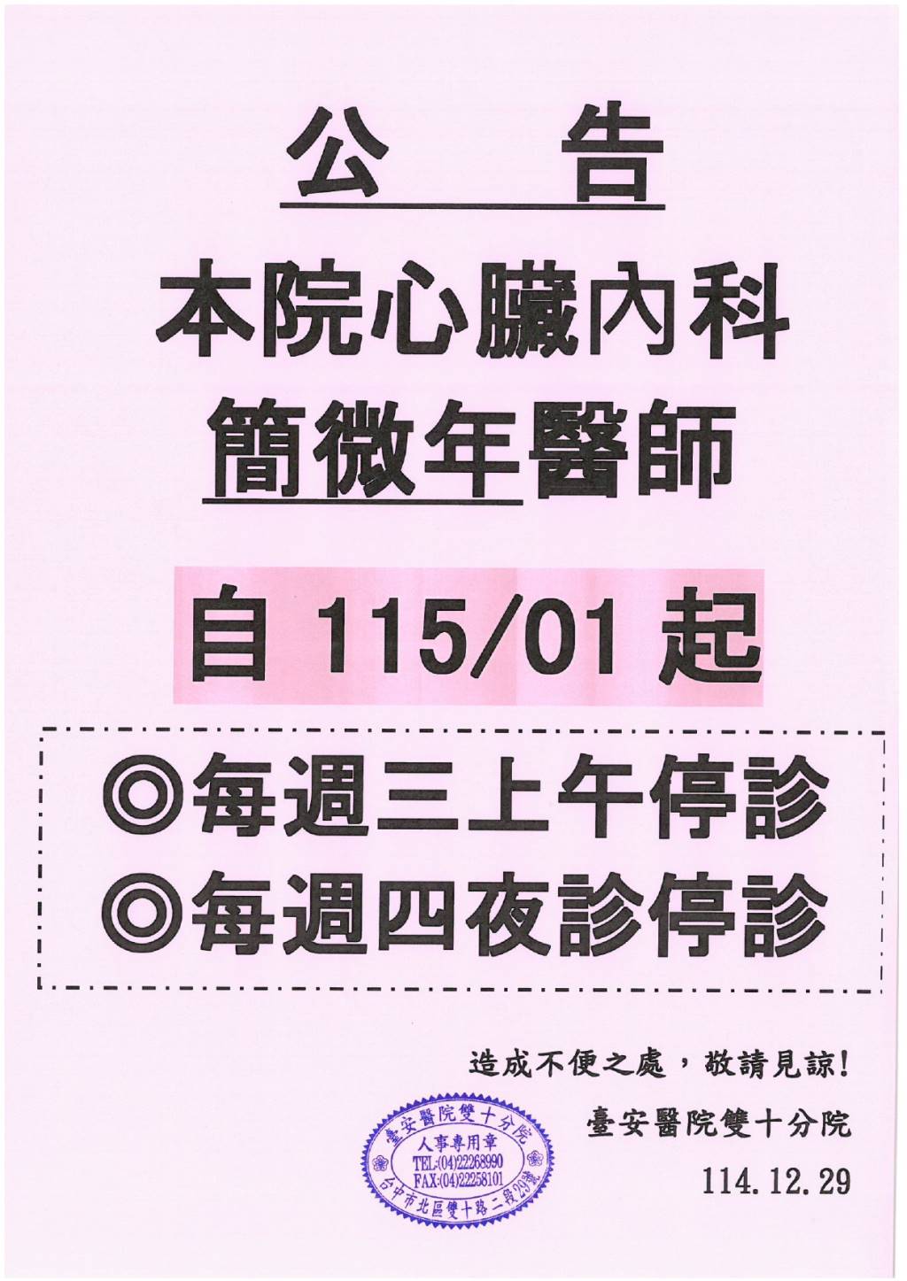 115年起,心臟內科簡微年醫師週三上午及週四夜診停診